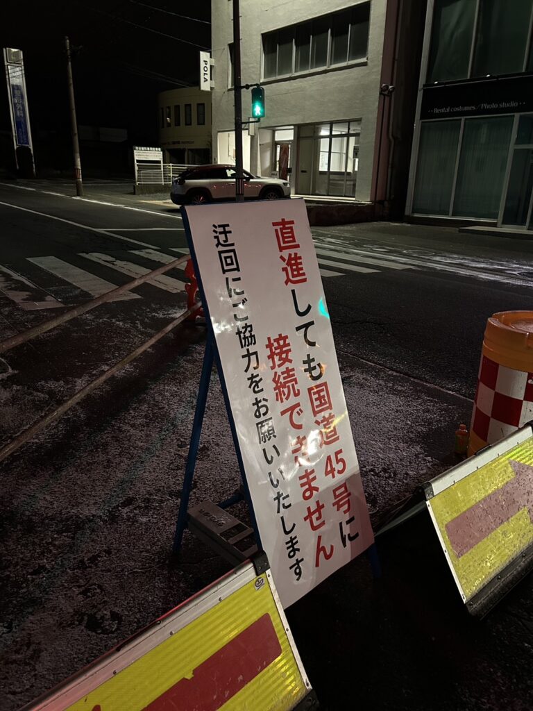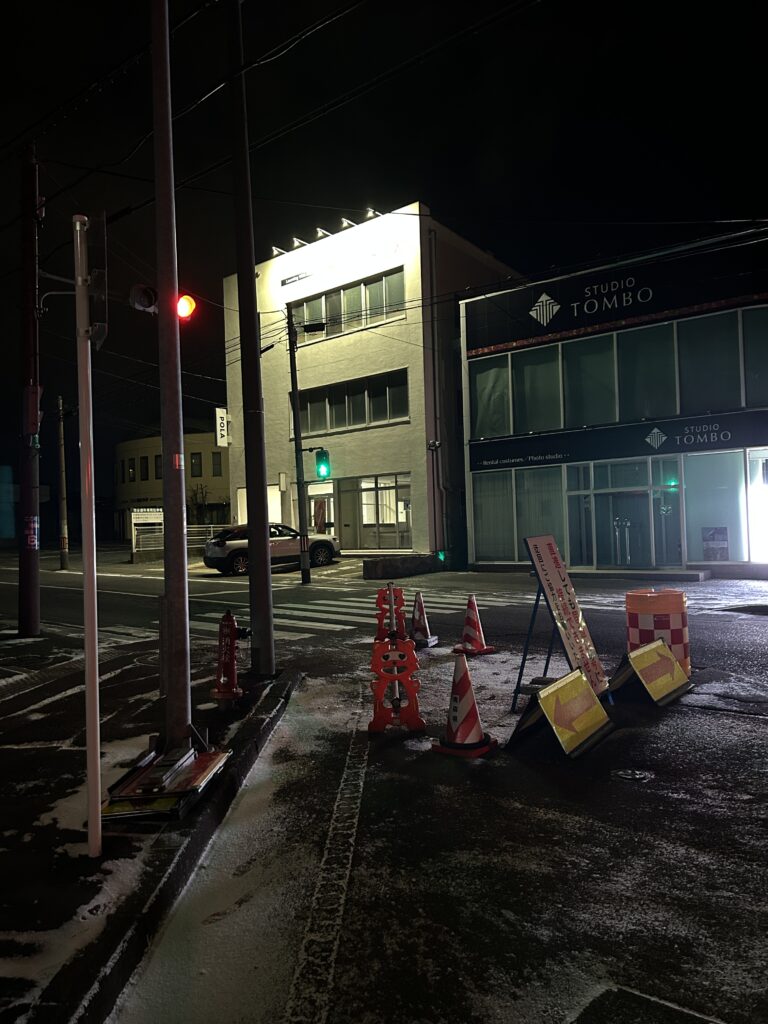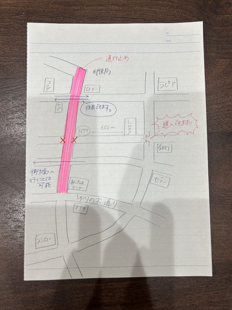 ※写真にあるようにコーンがあったり、注意書きがあったりしますが、小中野方面から来る場合直進できます。ラピア方面から来る場合右折できます。ゆりの木通り方面から来る場合左折できます。(警備員に確認済み)